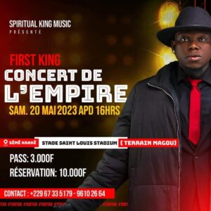 Préparez-vous à vivre une expérience hors du commun lors du concert de l’artiste béninois First King. L’événement aura lieu ce samedi 20 mai 2023 à 16 heures à Sèmè-Kraké, sur le Stade Saint Louis encore appelé terrain Magou. First King, un artiste talentueux et charismatique, vous promet une soirée inoubliable. Sa musique envoûtante et ses performances captivantes sauront vous faire danser et vibrer jusqu’au bout de la nuit. Ne tardez pas à réserver votre place, car cette soirée s’annonce mémorable et les billets risquent de s’envoler rapidement. Avec une entrée à 3.000 f cfa, vous avez aussi la possibilité de faire une réservation au tarif de 10 000 francs. Il s’agit d’une opportunité pour les mélomanes de découvrir et d’apprécier le talent exceptionnel de First King lors de ce concert.