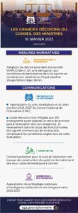 Sous la houlette du Président de la République Patrice Talon, le Conseil des Ministres s’est réuni ce mercredi 18 janvier 2023. Au cours de ce rendez-vous hebdomadaire, plusieurs décisions ont été prises dont voici les grandes lignes :