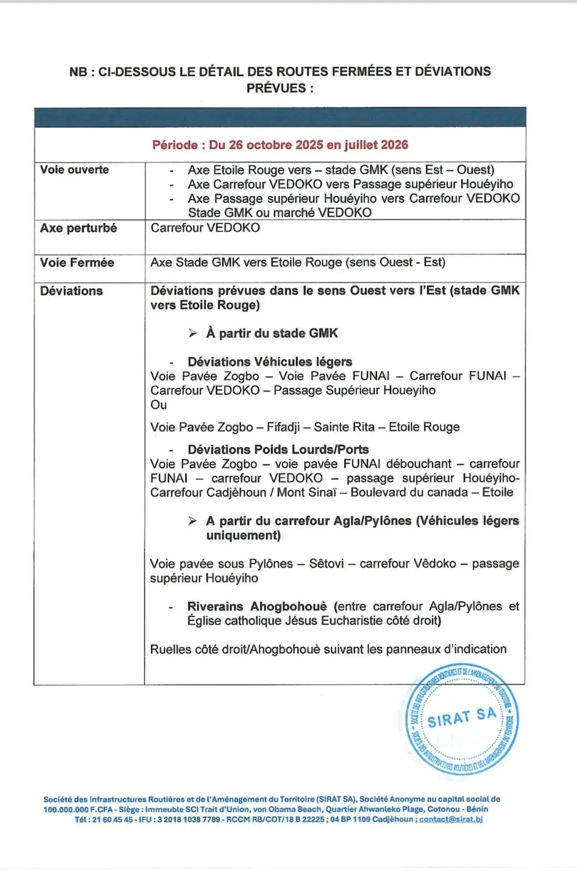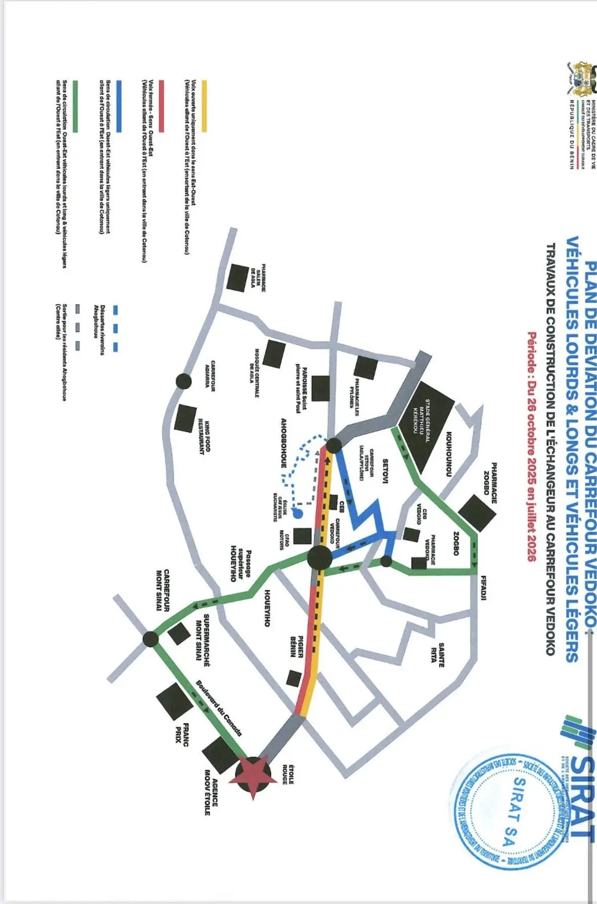 Dans le cadre du démarrage des travaux de construction de l’échangeur de Vêdoko, au sud du Bénin, plusieurs axes seront fermés à la circulation. L’information a été rendue publique à travers un communiqué daté du mardi 14 octobre 2025, émis par la direction générale de la Société des Infrastructures et de l’Aménagement du Territoire (SIRAT).