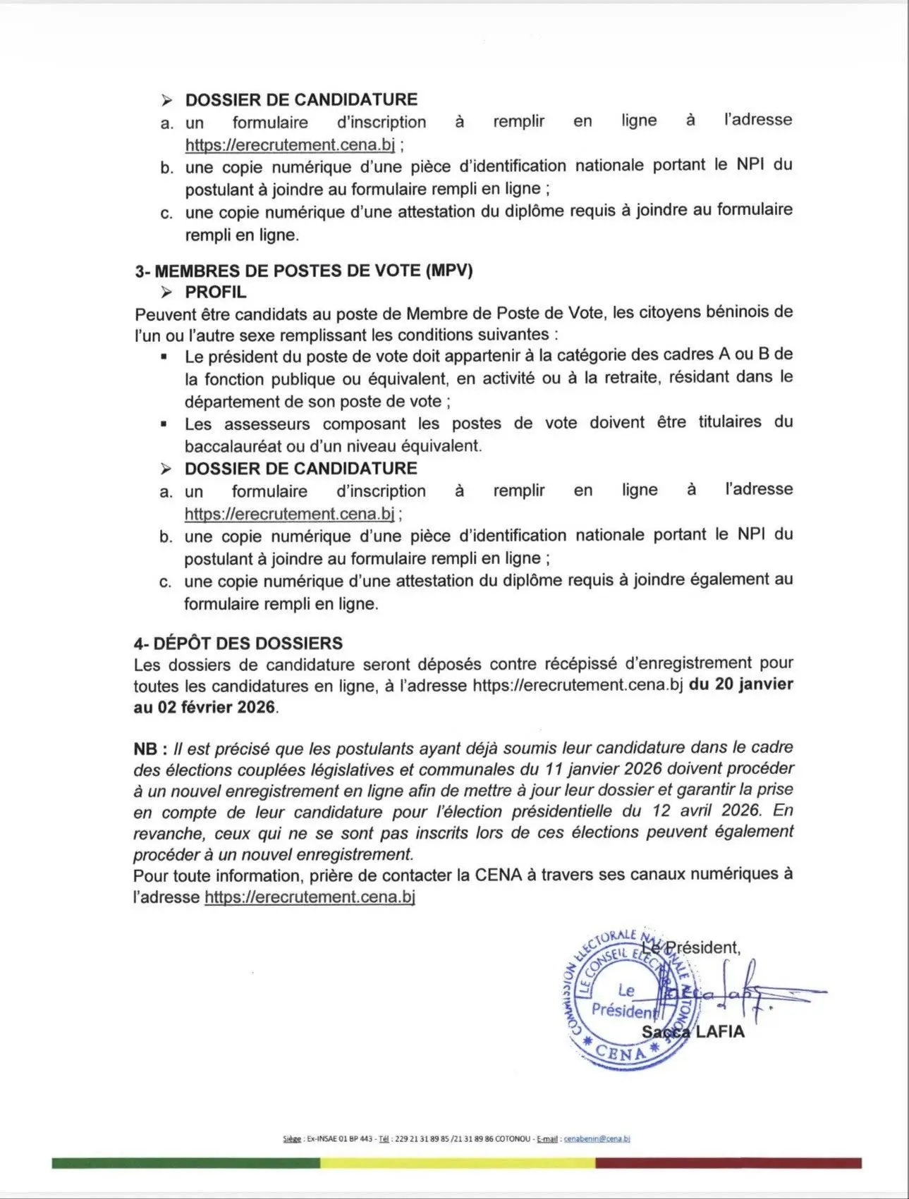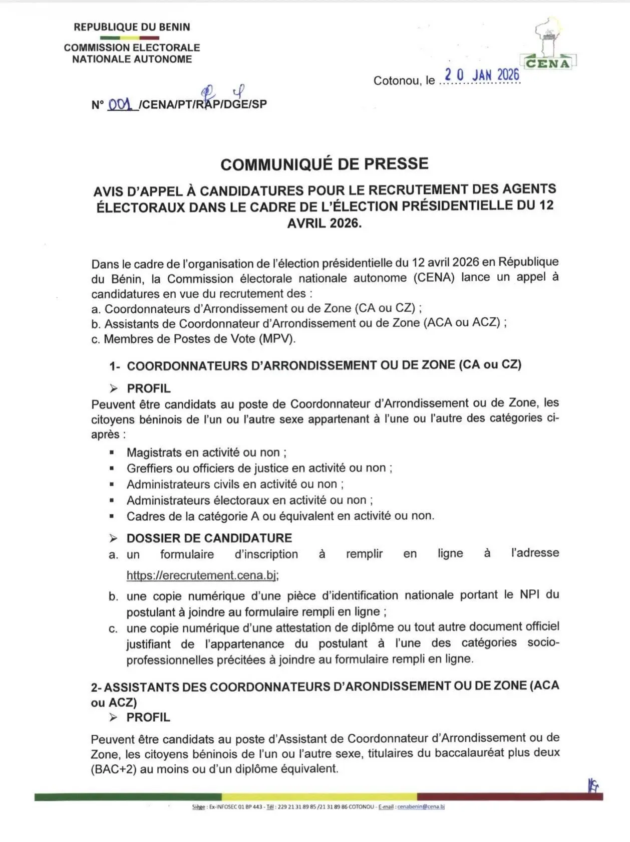 L’appel à candidatures concerne trois catégories de postes: Coordonnateurs d’Arrondissement ou de Zone (CA/CZ), Assistants de Coordonnateur (ACA/ACZ) et Membres de Postes de Vote (MPV). Pour les fonctions de coordination, la CENA cible des citoyens béninois disposant d’une solide expérience administrative ou judiciaire, notamment magistrats, greffiers, officiers de justice, administrateurs civils ou cadres de catégorie A. Les candidats à ces postes doivent compléter un formulaire d’inscription en ligne, présenter une pièce d’identité nationale comportant le Numéro Personnel d’Identification (NPI) et fournir une attestation de diplôme ou tout autre document officiel justifiant leur appartenance à l’une des catégories socioprofessionnelles requises.
