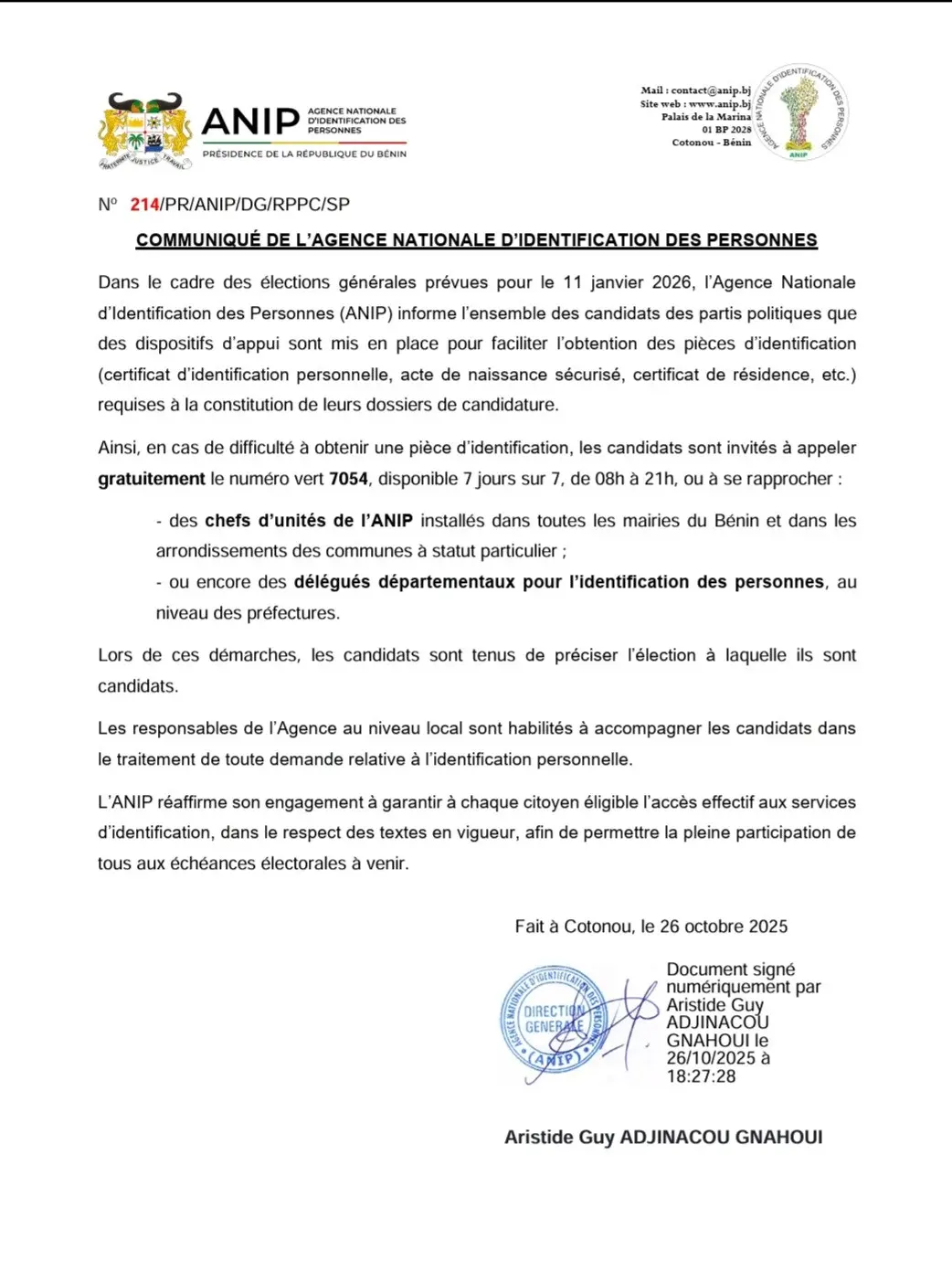 Dans un communiqué signé par son directeur général, M. Aristide Adjinacou Gnanhoui, l’Agence nationale d’identification des personnes (ANIP) précise avoir mis en place des dispositifs d’appui visant à faciliter l’obtention des pièces d’identification pour les candidats potentiels aux élections communales et législatives du 11 janvier 2026. L’agence rappelle que ces pièces telles que le certificat d’identification personnelle, l’acte de naissance sécurisé et le certificat de résidence sont requises pour la constitution des dossiers de candidature.