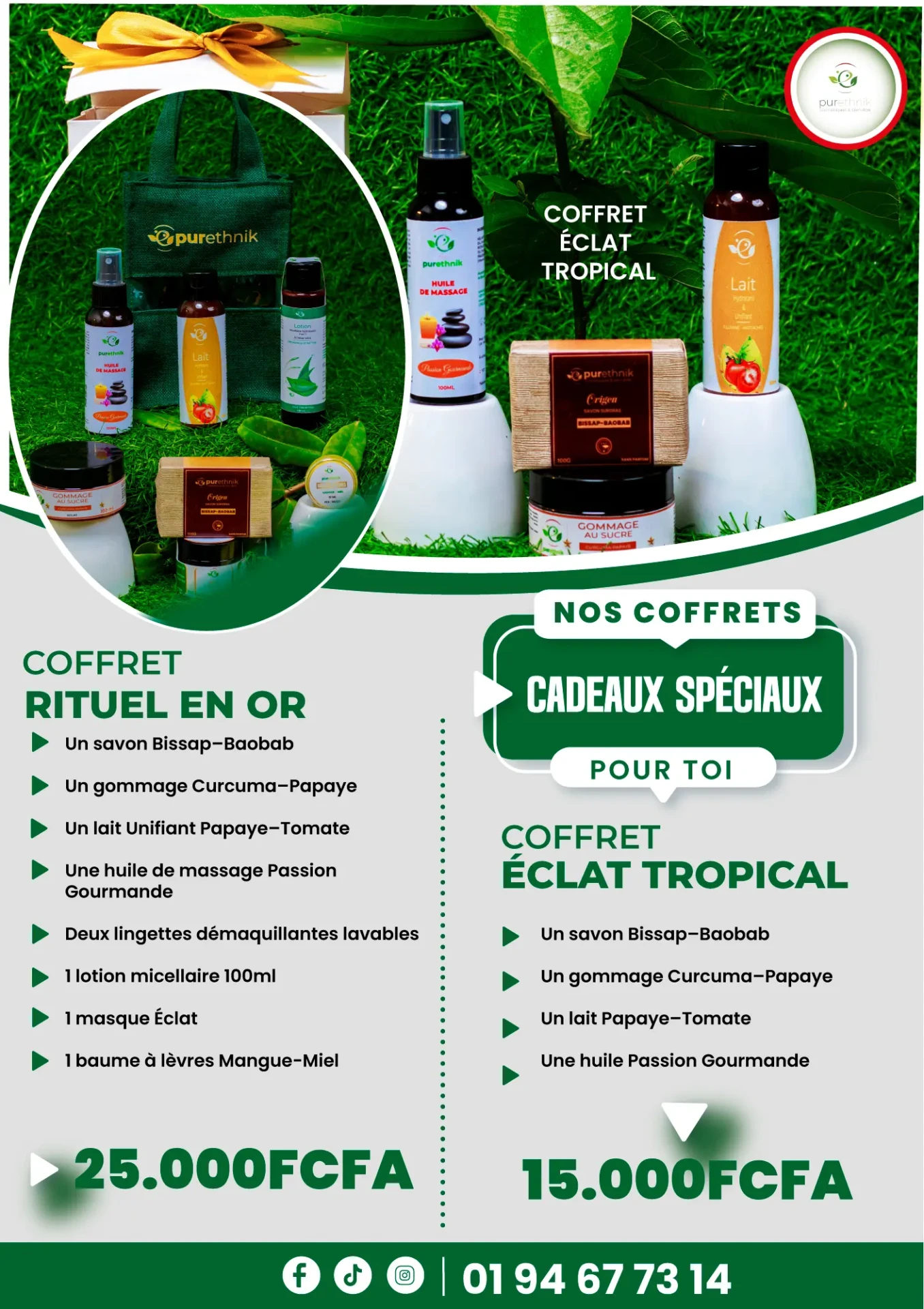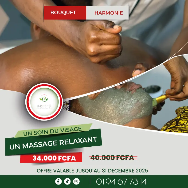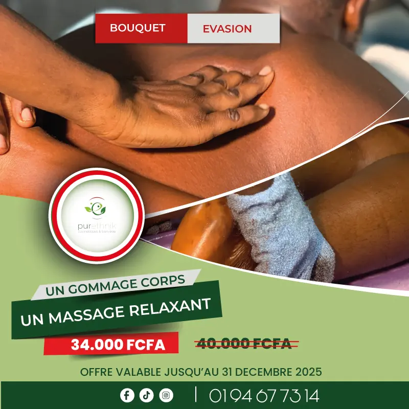 Le BOUQUET HARMONIE combine une séance de massage relaxant et un soin du visage, proposé à 34 000 FCFA au lieu de 40 000 FCFA. Pour le même montant, le Bouquet Évasion associe un massage relaxant à un gommage corporel, idéal pour purifier la peau et relancer l’éclat naturel. L’offre la plus complète, le Bouquet Prestige, réunit massage relaxant, soin du visage et gommage corps pour 48 000 FCFA au lieu de 60 000 FCFA, offrant une expérience globale de bien-être. En parallèle, Purethnik propose une seconde catégorie d’offres dédiée aux amoureux des cosmétiques naturels, avec deux coffrets conçus pour enrichir la routine beauté au quotidien. Le COFFRET ÉCLAT TROPICAL, disponible à 15 000 FCFA, comprend un lait hydratant et unifiant, un savon au bissap et au baobab, un gommage au sucre curcuma-papaye et une huile de massage à la passion gourmande. Plus complet, le COFFRET RITUEL EN OR, proposé à 25 000 FCFA, rassemble une lotion micellaire hydratante, un lait hydratant et unifiant, un gommage au sucre curcuma-papaye, un masque visage éclat, un savon bissap-baobab, une huile de massage passion gourmande, un baume à lèvres ainsi que deux lingettes lavables.
