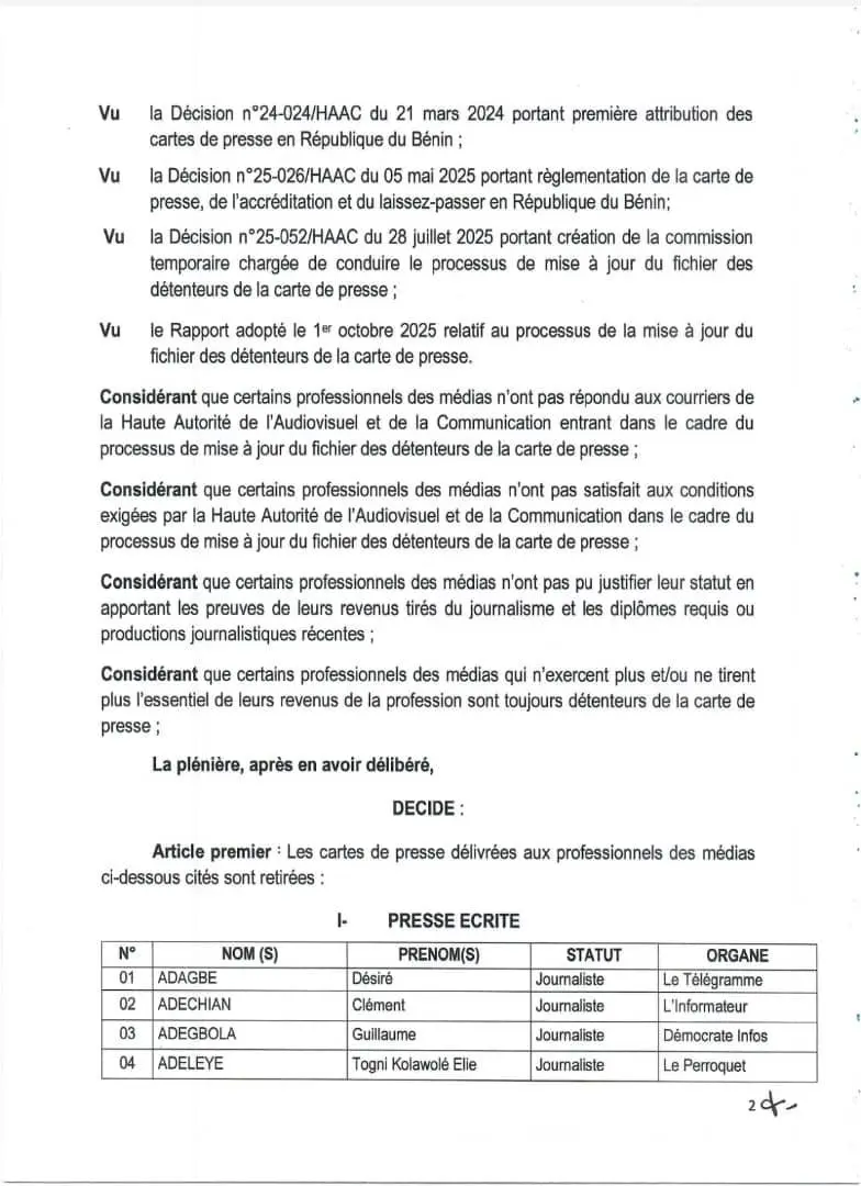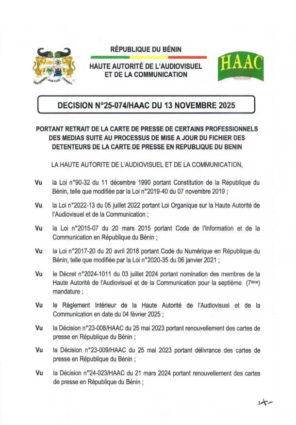 La Haute Autorité de l’audiovisuel et de la communication (HAAC) durcit le ton. Réunie en séance plénière le jeudi 13 novembre 2025, l’institution de régulation des médias a annoncé une série de mesures, dont le retrait de la carte de presse à 130 journalistes ne remplissant plus les conditions requises. La décision, rendue publique en présence du président Édouard Loko et des conseillers, fait suite à plusieurs constats d’irrégularités relevés après examen minutieux des rapports internes. La mesure touche 123 journalistes de la presse écrite et photojournalistes, ainsi que 7 professionnels de la radiodiffusion sonore. D’après la décision rendue, ces derniers ne remplissent plus les critères nécessaires pour conserver leur carte professionnelle.